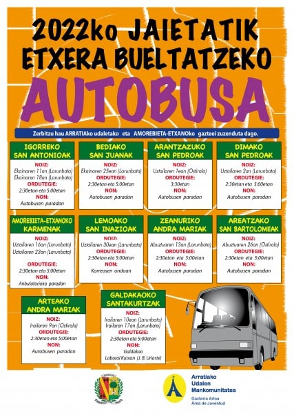 • 2022ko uda honetan, ekainetik irailera, autobus zerbitzua egongo da hamar udalerrietako jaietatik Amorebieta-Etxanora itzultzeko.