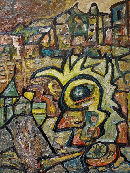 ‘Caras Escondidas en el Desván’ presenta una mirada profunda al mundo interior del artista, utilizando el desván como metáfora. En este espacio, se ocultan caras retorcidas que luego emergen para mezclarse entre colores y formas, creando un impacto visual cautivante. Las caras deformadas y caóticas desafían al espectador con sus grandes ojos abiertos, en una expresión artística que combina elementos del expresionismo, la abstracción, el surrealismo de los sueños, y la pintura naif y fauvista.
