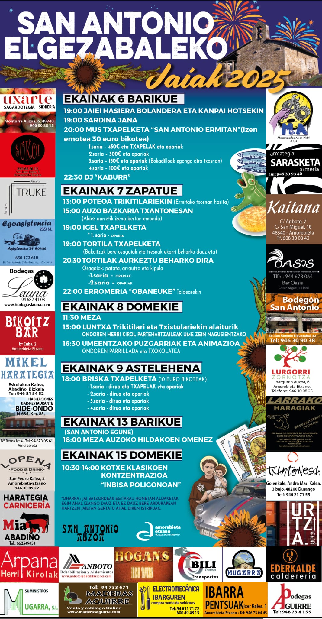 Las fiestas comenzarán con las tradicionales campanas y bolanderas, y hasta el lunes habrá múltiples actividades para el disfrute de todas y todos: sardinada popular, campeonatos de mus y brisca, poteo con trikitilaris, comida vecinal, concursos de igel y tortilla, romería con música en directo, misa, actividades infantiles con hinchables, parrillada y chocolatada.