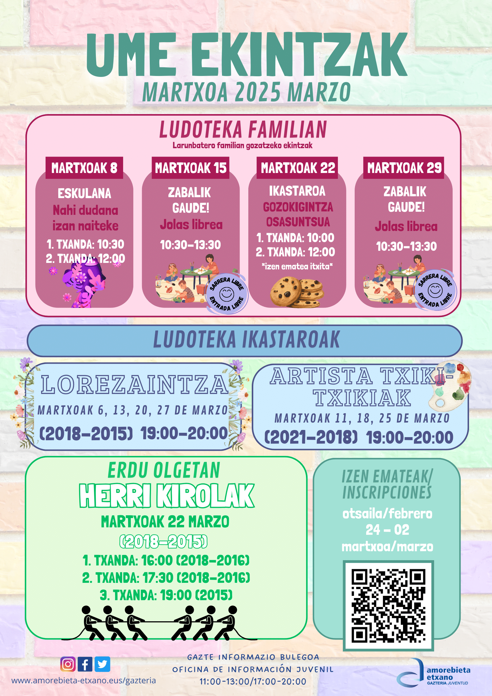 Amorebieta-Etxanoko Udalak haurrentzako eta familientzako ekintza egitarau anitz bezain zabala diseinatu du martxorako. Helburua da haur zein familia zornotzarrei aisialdirako eta ikaskuntzarako espazioak eskaintzea, sormena, talde-lana eta haurren eta familien parte-hartzea sustatzen duten jarduera ludiko eta hezitzaileen bidez.