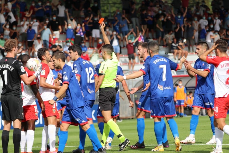 Los de Vélez de Mendizabal, que ha cumplido su partido oficial número 100 como técnico del Amorebieta, no se han conformado con la igualada y han seguido apretando. Una nueva recuperación en campo contrario ha tenido como consecuencia la expulsión del jugador del Almería Robertone. San José ha puesto el cuero para la carrera de Guruzeta, que ha sido derribado por detrás en el borde del área cuando se plantaba mano a mano contra el portero. A punto ha estado de llegar el 2-1 en el ecuador del primer acto, merced a un nuevo robo en zona peligrosa. Esta vez, el disparo de Iker Bilbao no ha obtenido premio.