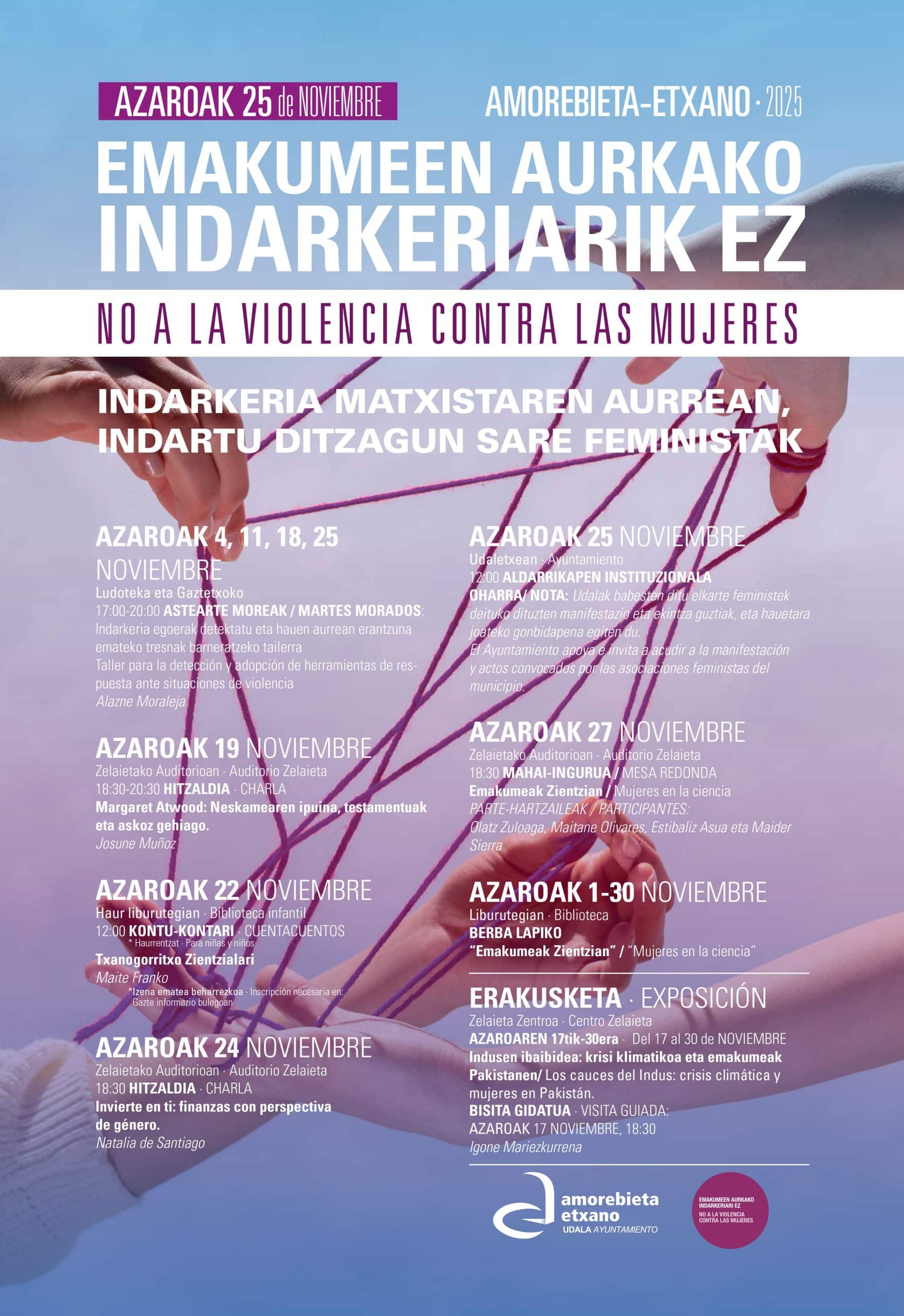 Azaroaren 25a, Emakumearen Aurkako Indarkeria Desagerrarazteko Nazioarteko Eguna dela eta, Amorebieta-Etxanoko Udalak ekintza-egitarau berezia eta anitza antolatu du emakumeen aurkako indarkeria ikusarazteko, salatzeko eta desagerrarazteko. Berdintasunarekiko eta justizia sozialarekiko konpromiso irmoaren oinarrian, herritar guztiei zuzendutako sentsibilizazio-jarduerak eskainiko dira, edozein motatako genero-indarkeriaren aurkako borrokan herritarren hausnarketa eta konpromisoa sustatuz.