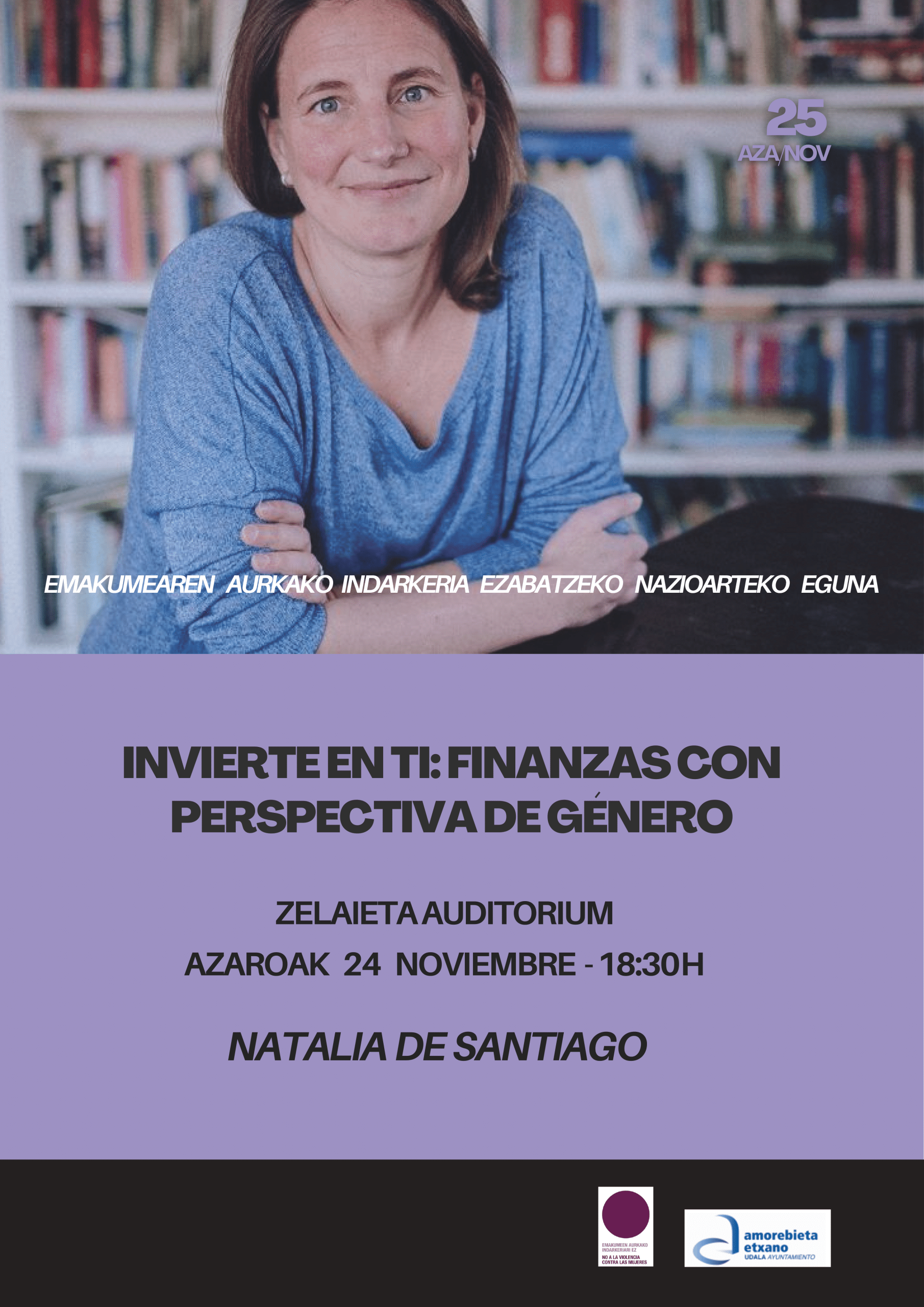 Programazioak azaroaren 24an jarraituko du, “Invierte en ti: finanzas con perspectiva de género” izeneko hitzaldiarekin. Zelaietako Auditorioan egingo da, 18:30ean. Natalia de Santiagok informazio saio bat eskainiko du finantza pertsonaletan eta kudeaketa ekonomikoan genero ikuspegia nola txertatu azaltzeko.